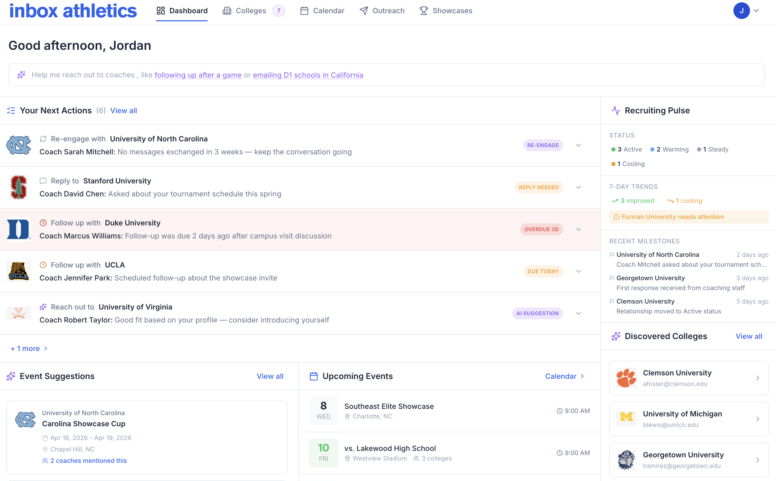 Inbox Athletics organizes your coach conversations, reminds you to follow up, and helps you communicate like a pro.